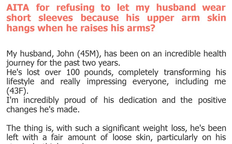 However, the husband's perspective is equally, if not more, poignant. He has undergone a monumental transformation, achieving a significant health milestone. Loose skin is a common, often unavoidable, side effect of extreme weight loss. It's a testament to his hard work, not a flaw. To have his partner, who should be his biggest cheerleader, highlight this physical reality as an 'issue' and demand he cover up, must be incredibly disheartening and undermine his newfound confidence.\n