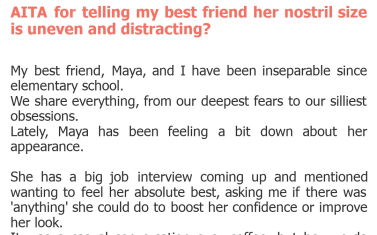 "AITA for telling my best friend her nostril size is uneven and distracting?"