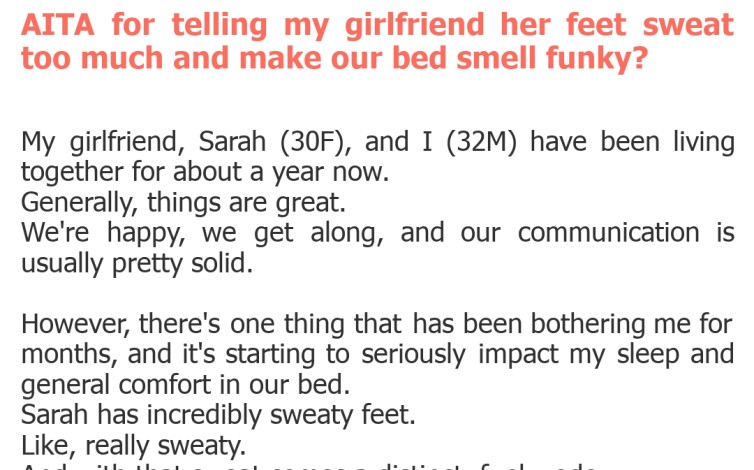 "AITA for telling my girlfriend her feet sweat too much and make our bed smell funky?"