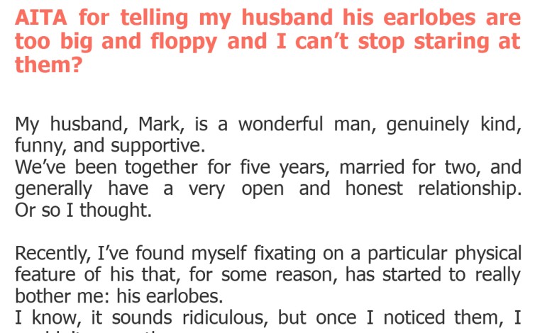 "AITA for telling my husband his earlobes are too big and floppy and I can’t stop staring at them?"