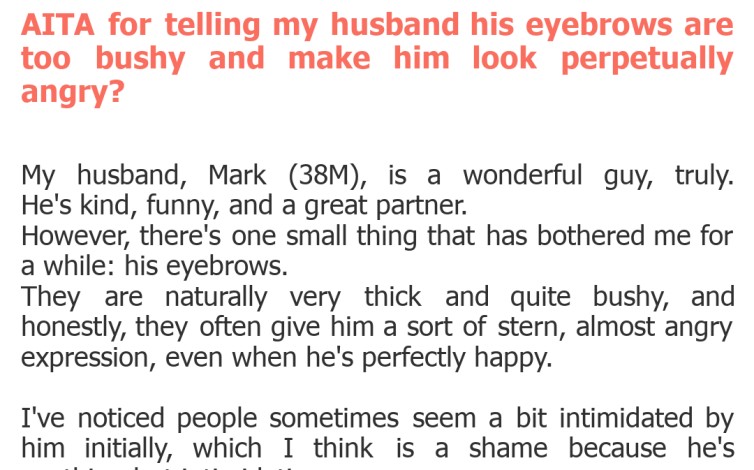 "AITA for telling my husband his eyebrows are too bushy and make him look perpetually angry?"