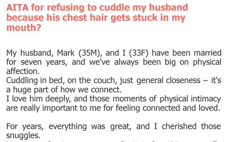 "AITA for refusing to cuddle my husband because his chest hair gets stuck in my mouth?"