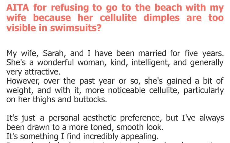 "AITA for refusing to go to the beach with my wife because her cellulite dimples are too visible in swimsuits?"