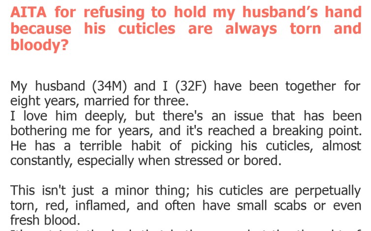 "AITA for refusing to hold my husband’s hand because his cuticles are always torn and bloody?"