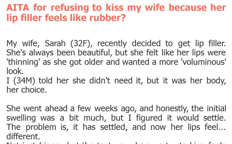 "AITA for refusing to kiss my wife because her lip filler feels like rubber?"