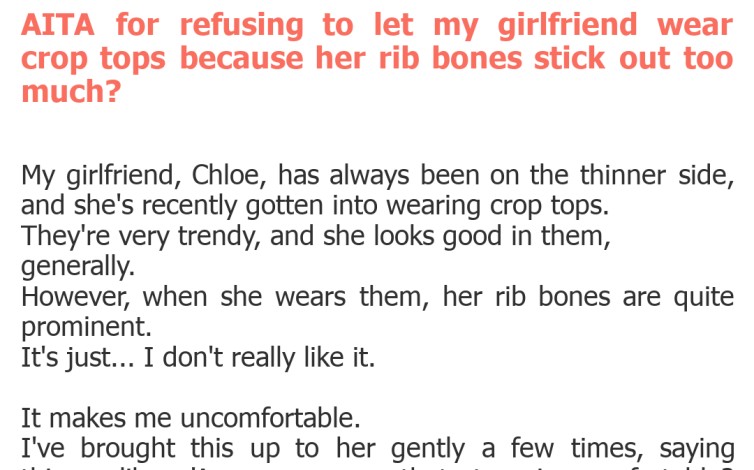 "AITA for refusing to let my girlfriend wear crop tops because her rib bones stick out too much?"