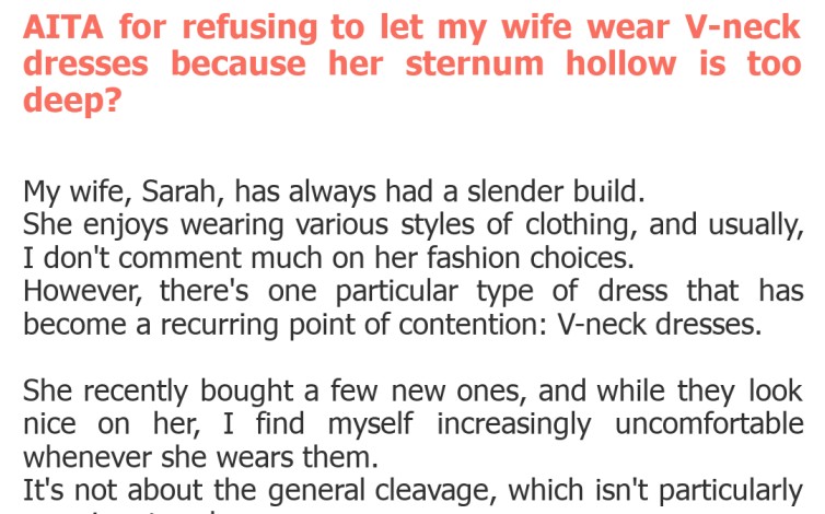 "AITA for refusing to let my wife wear V-neck dresses because her sternum hollow is too deep?"