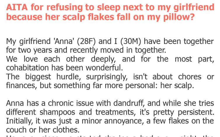 "AITA for refusing to sleep next to my girlfriend because her scalp flakes fall on my pillow?"