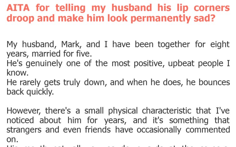 "AITA for telling my husband his lip corners droop and make him look permanently sad?"
