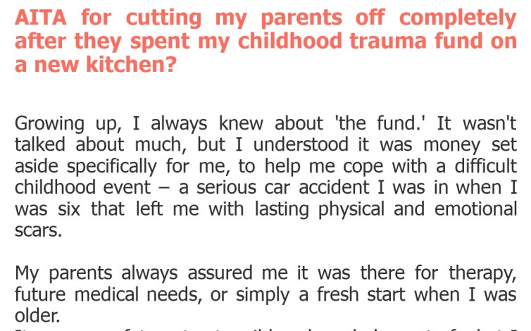 "AITA for cutting my parents off completely after they spent my childhood trauma fund on a new kitchen?"