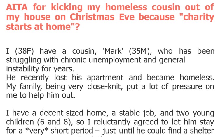 "AITA for kicking my homeless cousin out of my house on Christmas Eve because "charity starts at home"?"