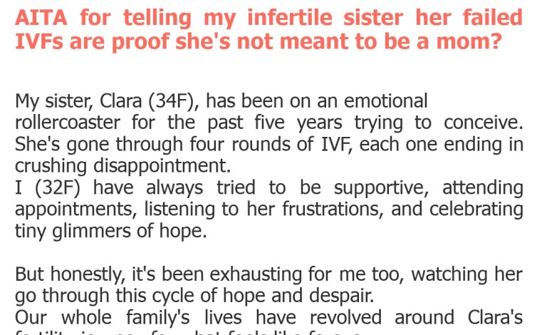 "AITA for telling my infertile sister her failed IVFs are proof she's not meant to be a mom?"