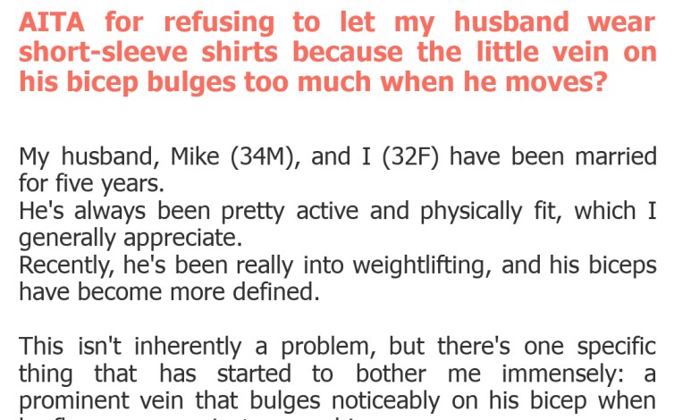 This is one of those posts that makes you do a double-take. On one hand, everyone is entitled to their aesthetic preferences. What one person finds appealing, another might find off-putting. The original poster genuinely seems uncomfortable with the sight of her husband's bicep vein, describing it as 'distracting' and 'too much.' It's a visceral reaction she's experiencing, and invalidating personal feelings is rarely helpful in a relationship. \n However, where a personal preference crosses into controlling behavior is a crucial distinction. Requesting a partner to alter their appearance or wardrobe based on a personal dislike, especially when it's about a natural physical characteristic that results from a healthy habit, can be problematic. This isn't about a mismatched outfit or a shirt with a stain; it's about a part of his body. \n Mike's perspective, feeling like his wife is being controlling and unreasonable, is entirely valid. He works hard on his fitness and enjoys the comfort of short-sleeve shirts. To be told he needs to cover up a normal part of his anatomy because his wife finds it 'too much' can feel like a profound lack of acceptance and an infringement on his bodily autonomy. It's a direct criticism of his physical self. \n Relationships thrive on mutual respect and acceptance. While open communication about preferences is healthy, dictating wardrobe choices based on such a specific and minor physical detail can breed resentment. It risks making Mike feel self-conscious and unaccepted, potentially damaging the intimacy and trust in their marriage. Finding a balance here is key, but it's a tough one.
