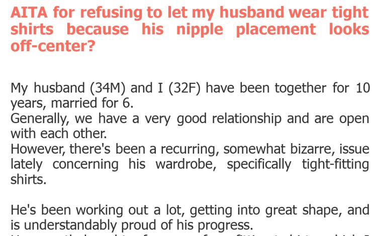 "AITA for refusing to let my husband wear tight shirts because his nipple placement looks off-center?"