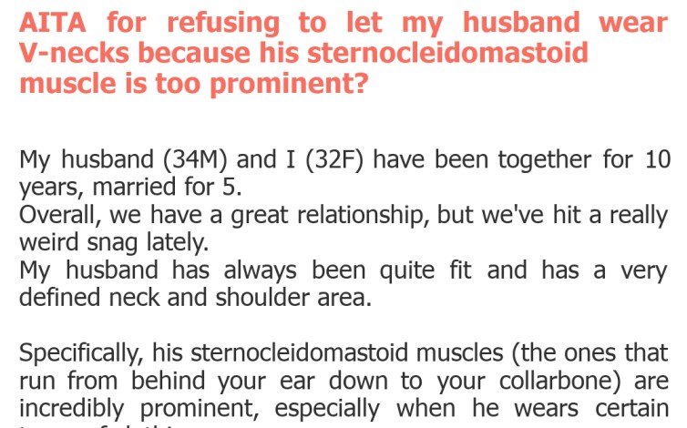 "AITA for refusing to let my husband wear V-necks because his sternocleidomastoid muscle is too prominent?"