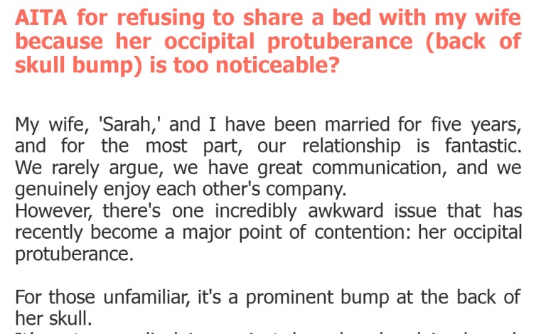 "AITA for refusing to share a bed with my wife because her occipital protuberance (back of skull bump) is too noticeable?"
