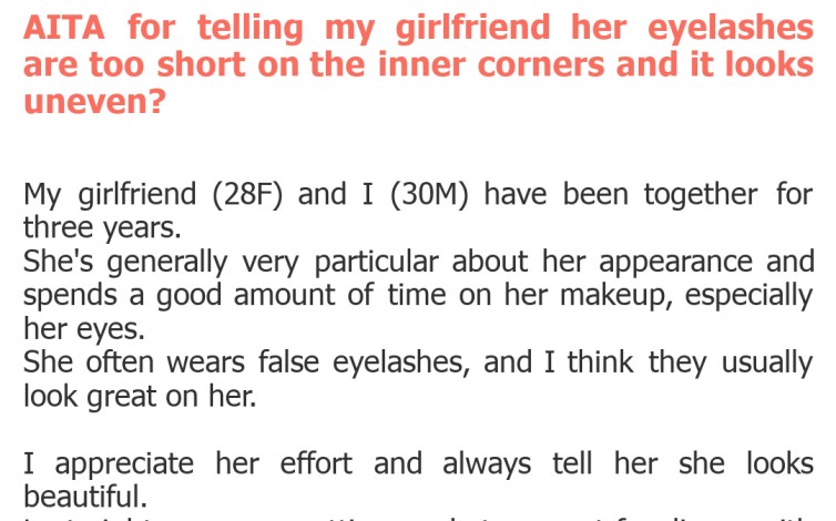 "AITA for telling my girlfriend her eyelashes are too short on the inner corners and it looks uneven?"