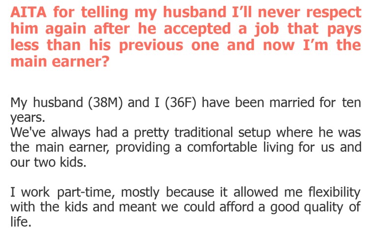 AITA for telling my husband I’ll never respect him again after he accepted a job that pays less than his previous one and now I’m the main earner?
