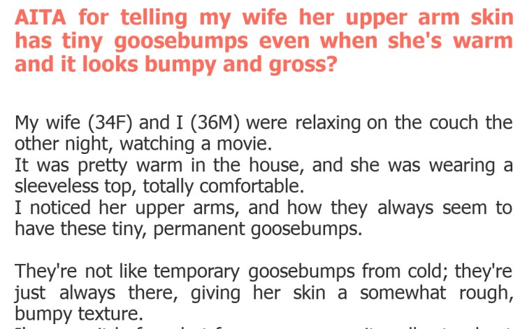 "AITA for telling my wife her upper arm skin has tiny goosebumps even when she's warm and it looks bumpy and gross?"