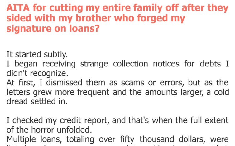 "AITA for cutting my entire family off after they sided with my brother who forged my signature on loans?"