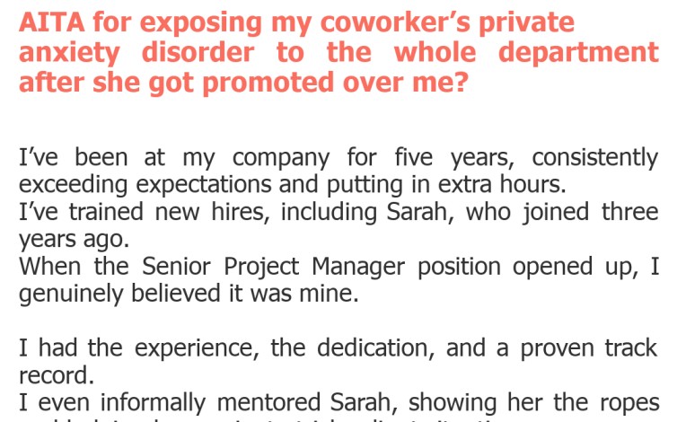 "AITA for exposing my coworker’s private anxiety disorder to the whole department after she got promoted over me?"