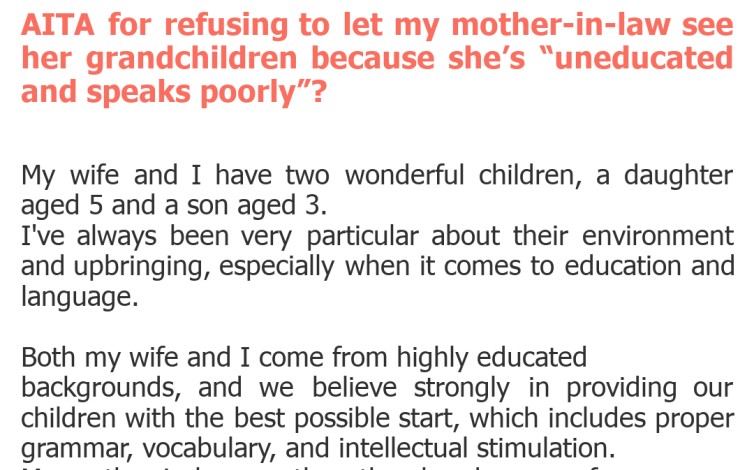 "AITA for refusing to let my mother-in-law see her grandchildren because she’s “uneducated and speaks poorly”?"