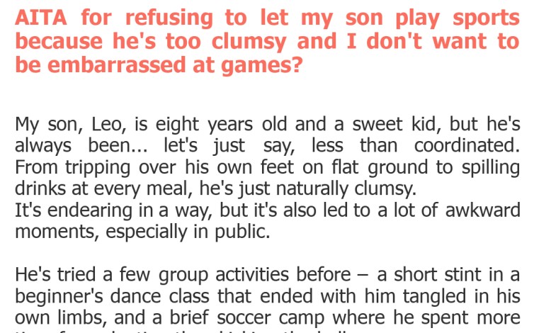 "AITA for refusing to let my son play sports because he's too clumsy and I don't want to be embarrassed at games?"