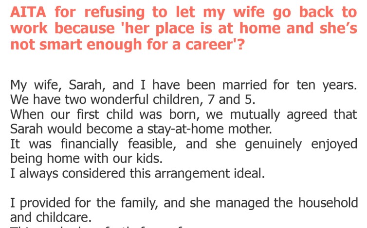 AITA for refusing to let my wife go back to work because ‘her place is at home and she’s not smart enough for a career’?
