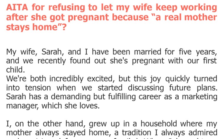 "AITA for refusing to let my wife keep working after she got pregnant because “a real mother stays home”?"