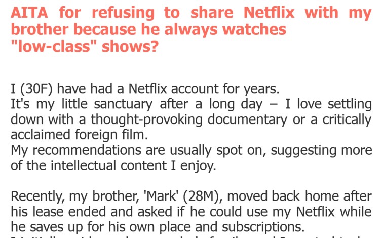 "AITA for refusing to share Netflix with my brother because he always watches "low-class" shows?"