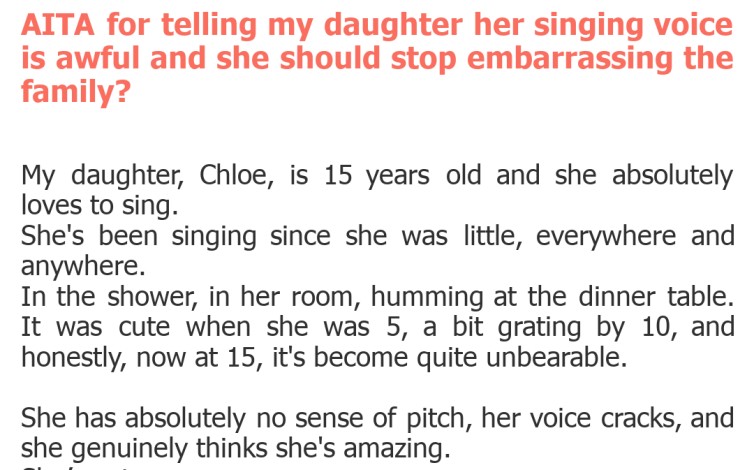"AITA for telling my daughter her singing voice is awful and she should stop embarrassing the family?"