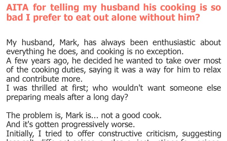 "AITA for telling my husband his cooking is so bad I prefer to eat out alone without him?"