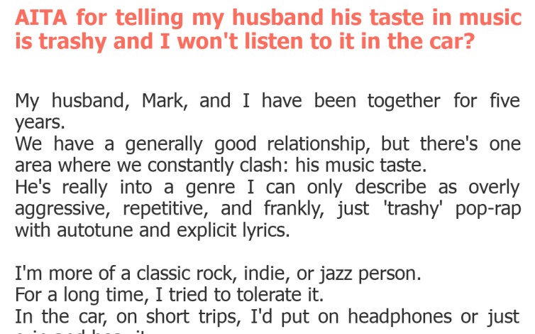 "AITA for telling my husband his taste in music is trashy and I won't listen to it in the car?"