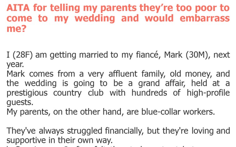 AITA for telling my parents they’re too poor to come to my wedding and would embarrass me?