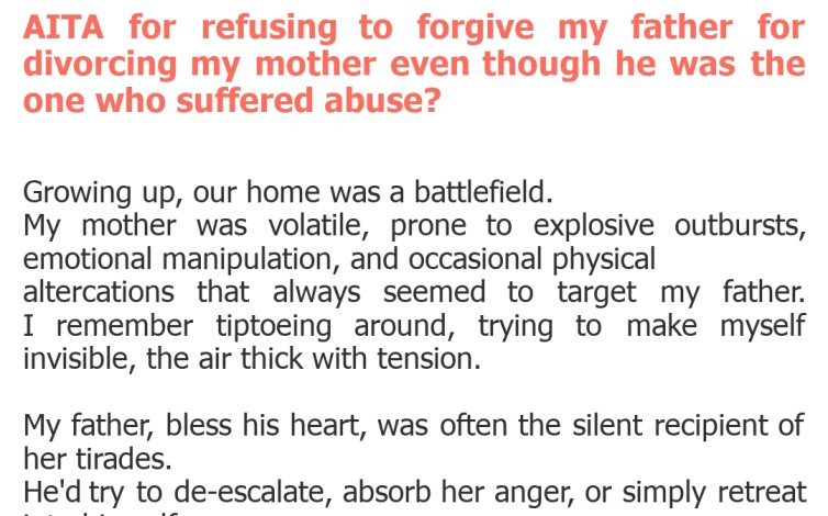"AITA for refusing to forgive my father for divorcing my mother even though he was the one who suffered abuse?"
