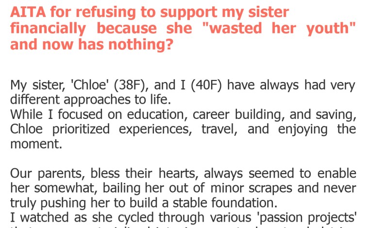 "AITA for refusing to support my sister financially because she "wasted her youth" and now has nothing?"