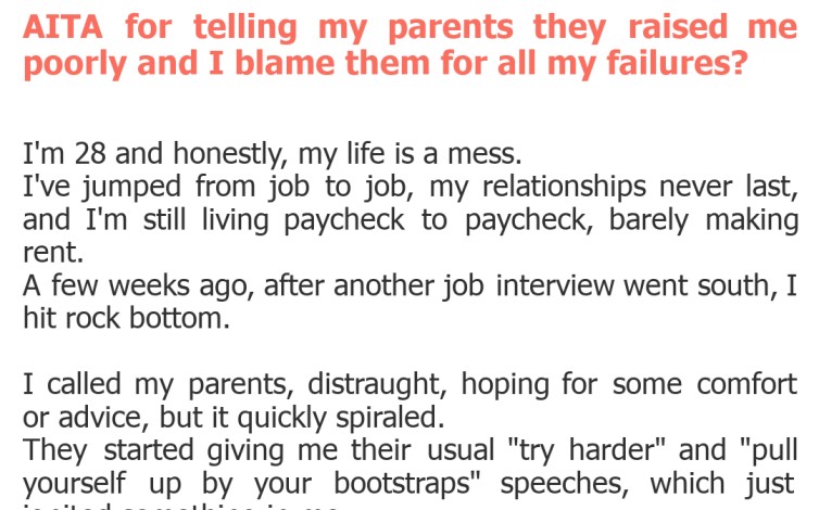 "AITA for telling my parents they raised me poorly and I blame them for all my failures?"