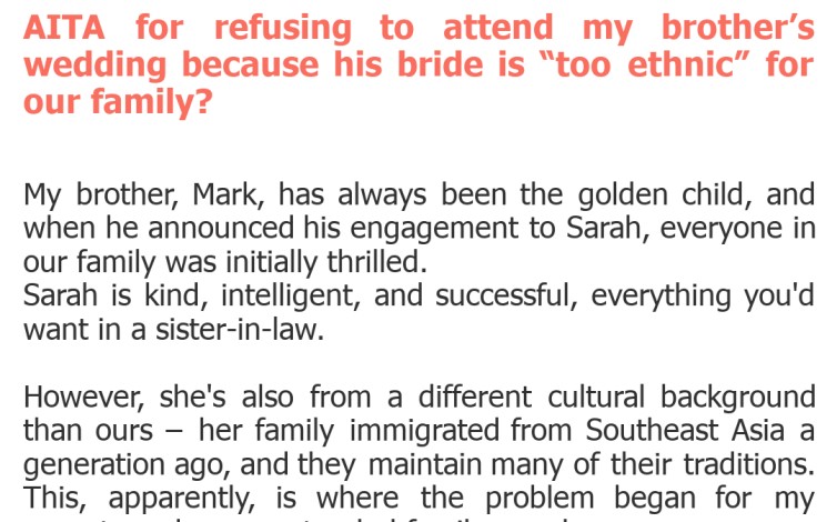 "AITA for refusing to attend my brother’s wedding because his bride is “too ethnic” for our family?"