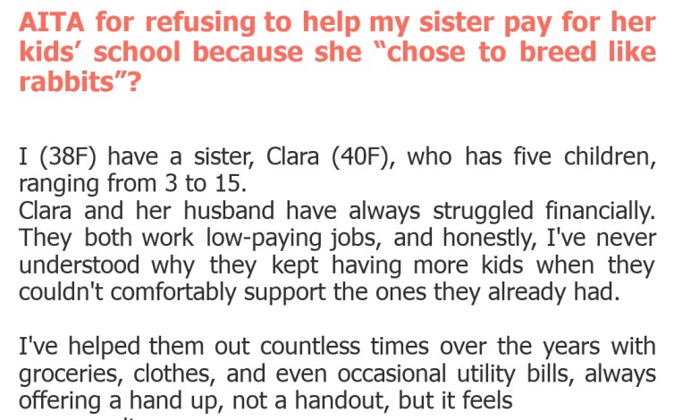 "AITA for refusing to help my sister pay for her kids’ school because she “chose to breed like rabbits”?"