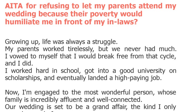 AITA for refusing to let my parents attend my wedding because their poverty would humiliate me in front of my in-laws?