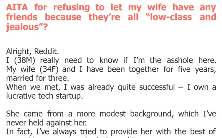 "AITA for refusing to let my wife have any friends because they’re all “low-class and jealous”?"