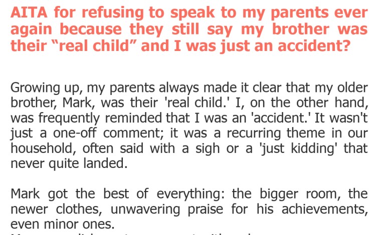 AITA for refusing to speak to my parents ever again because they still say my brother was their “real child” and I was just an accident?