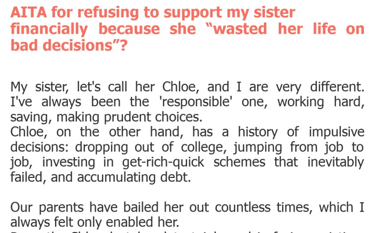 "AITA for refusing to support my sister financially because she “wasted her life on bad decisions”?"
