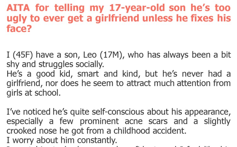 "AITA for telling my 17-year-old son he’s too ugly to ever get a girlfriend unless he fixes his face?"