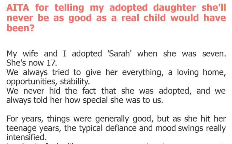 Oh boy, folks, we've got a truly challenging one on our hands today. The title alone is enough to make anyone's stomach churn: 'AITA for telling my adopted daughter she’ll never be as good as a real child would have been?' It's a statement that cuts to the core of identity and belonging, especially for an adopted individual. We're diving deep into some fraught family dynamics today, so buckle up, because this one is heavy.