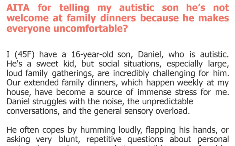 "AITA for telling my autistic son he’s not welcome at family dinners because he makes everyone uncomfortable?"