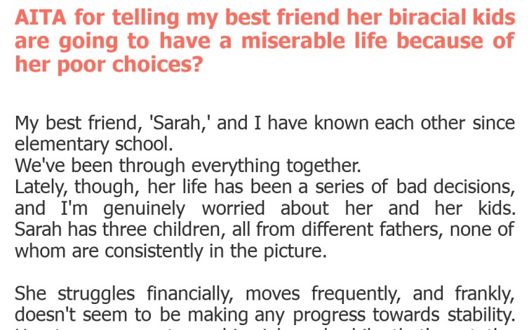 "AITA for telling my best friend her biracial kids are going to have a miserable life because of her poor choices?"