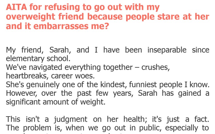 However, the impact of these feelings on Sarah, the friend, cannot be overstated. Being told that your appearance makes a friend unwilling to accompany you in public is incredibly hurtful and invalidating. It suggests that her worth or the value of her friendship is diminished by how others perceive her body, which is a cruel message to send, even if unintended. This experience can chip away at her self-esteem and trust.