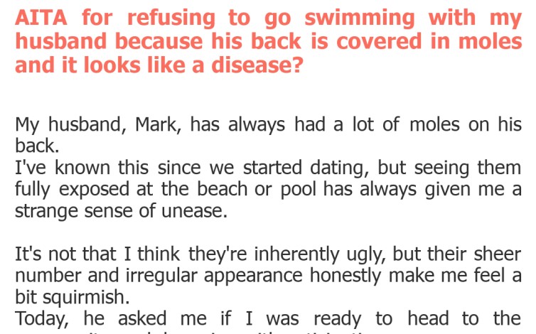 "AITA for refusing to go swimming with my husband because his back is covered in moles and it looks like a disease?"