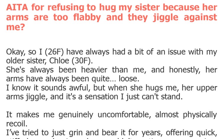 "AITA for refusing to hug my sister because her arms are too flabby and they jiggle against me?"